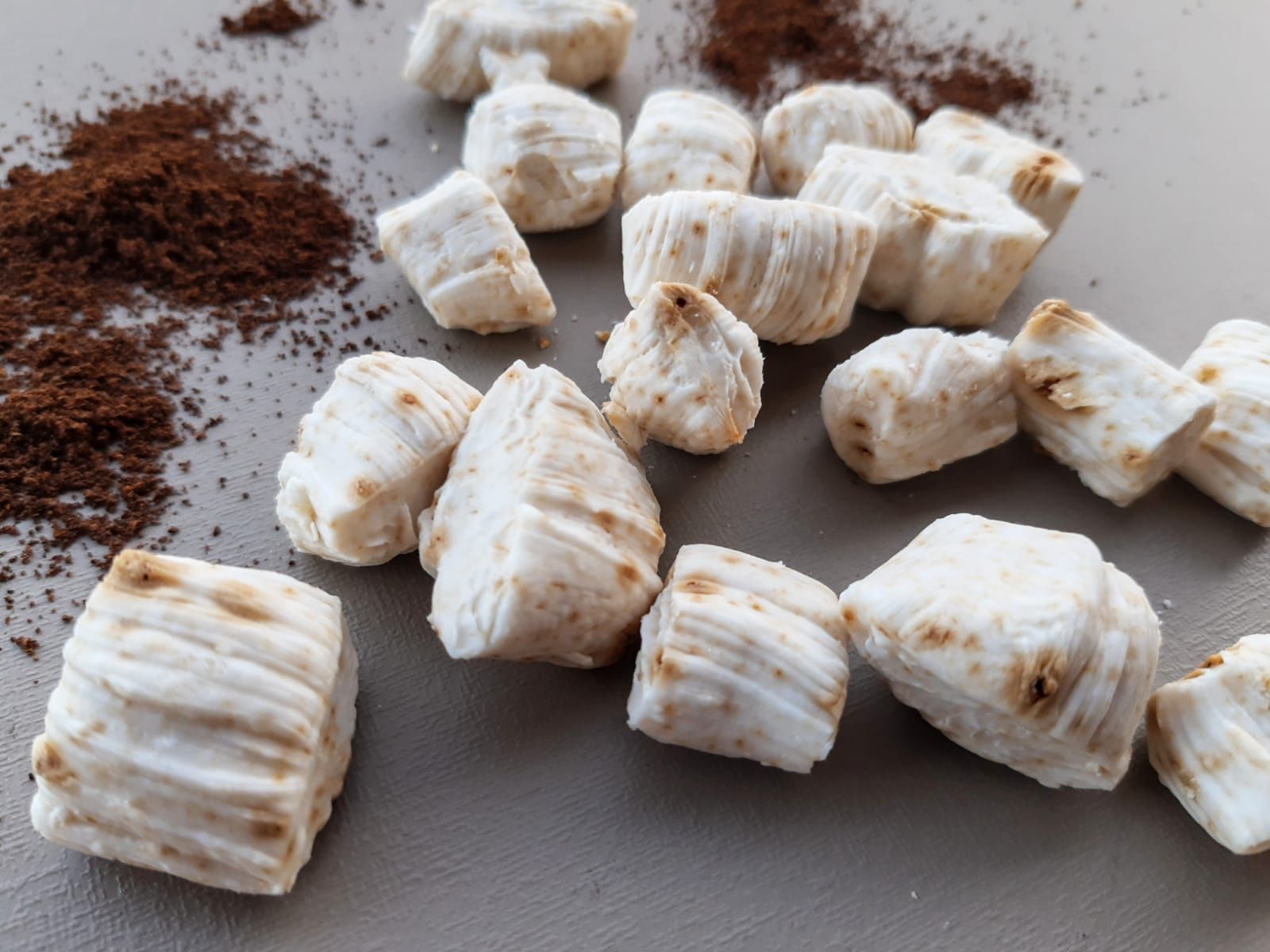 Bala de coco tradicional com café. A linha de café solúvel que utilizamos é elaborada com grãos selecionados e de alta qualidade. Proporcionando um sabor marcante do café. Além de não ter glúten, lactose e ser vegana. Contém aproximadamente 100 balas.