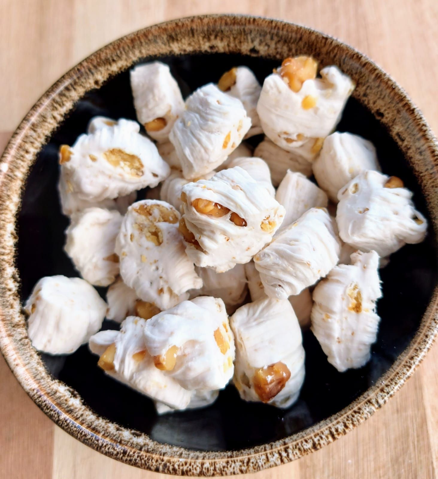 Bala de coco tradicional com nozes entremeadas na massa. Impossível comer apenas uma. Além de não ter glúten, lactose e ser vegana. Contém aproximadamente 80 balas.