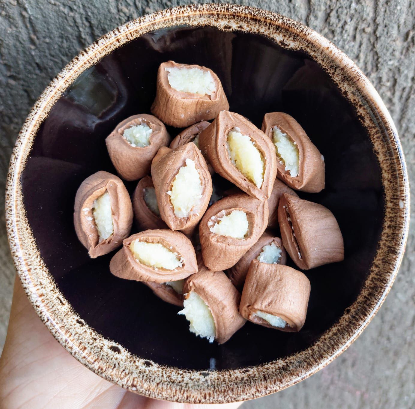 Bala de coco tradicional feita com cacau 100% e recheio com beijinho. Impossível comer apenas uma. Peça a sua! Contém aproximadamente 80 balas.